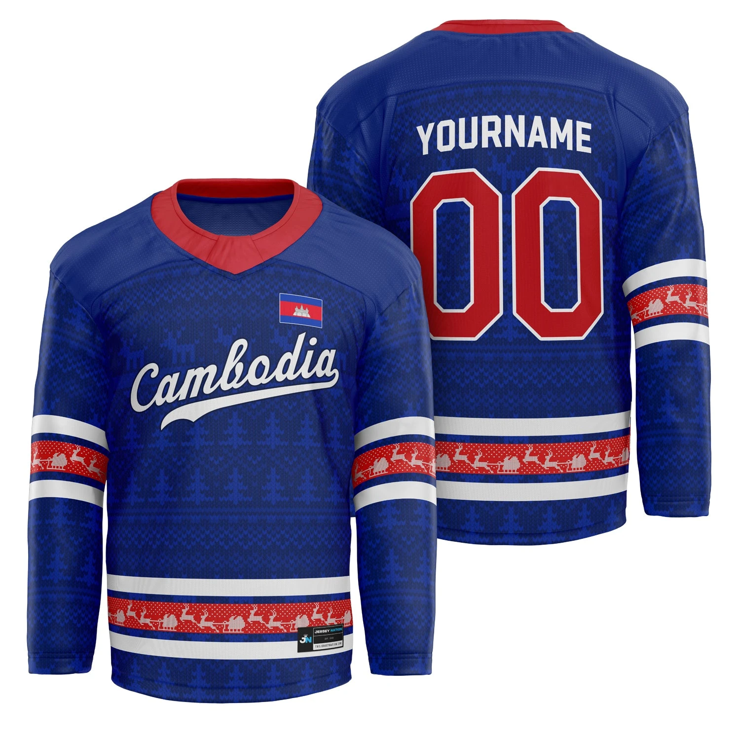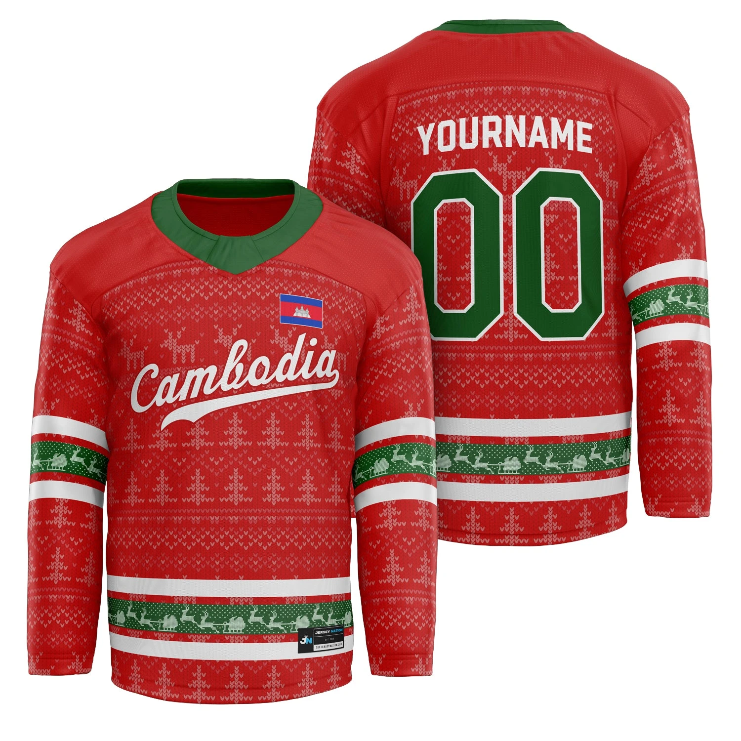 Show your Cambodian pride this holiday season with our fully sublimated Cambodia Christmas Custom Hockey Jersey. Designed with festive Christmas Holiday patterns and national colors, this jersey is perfect for Christmas parties, family gatherings, and holiday gifting.