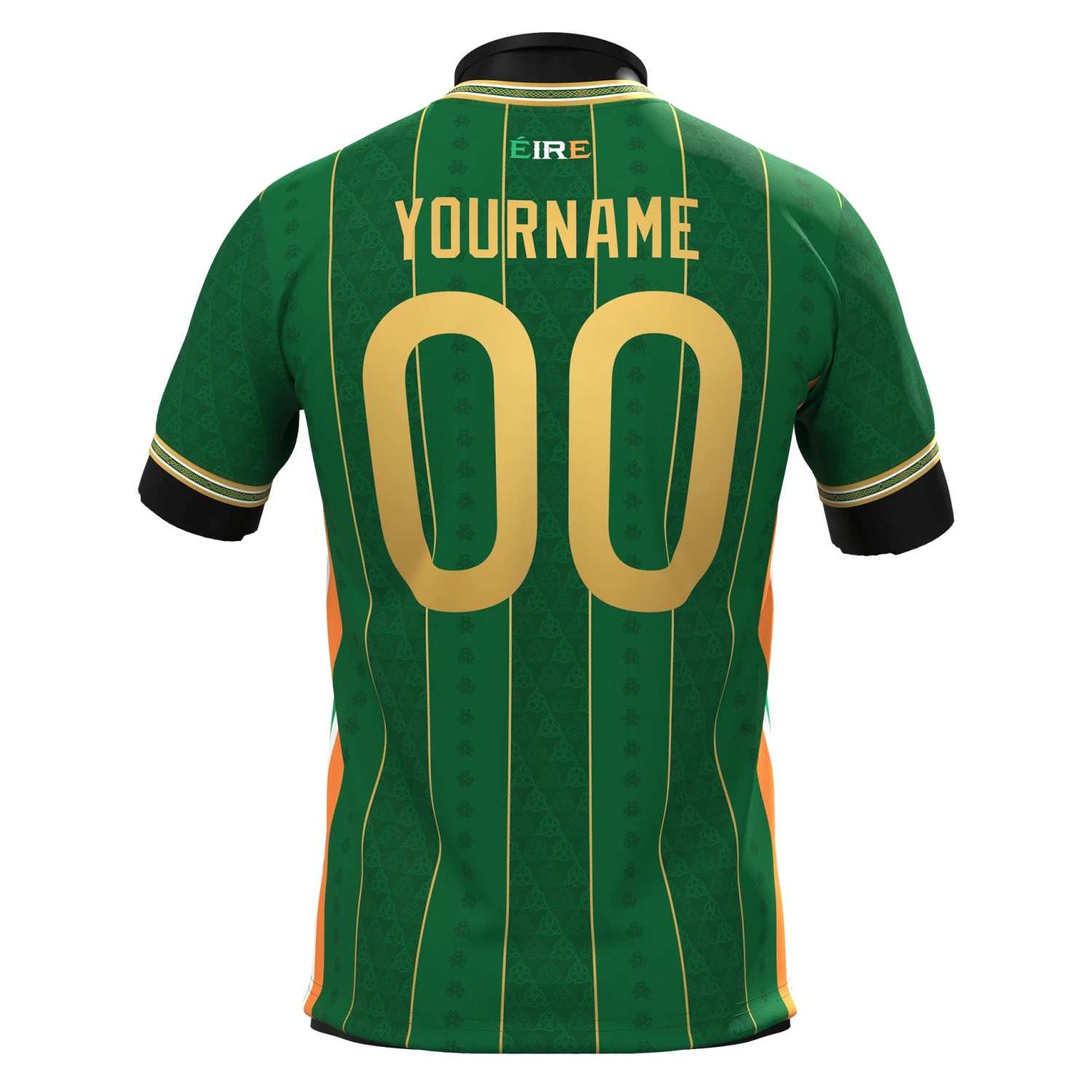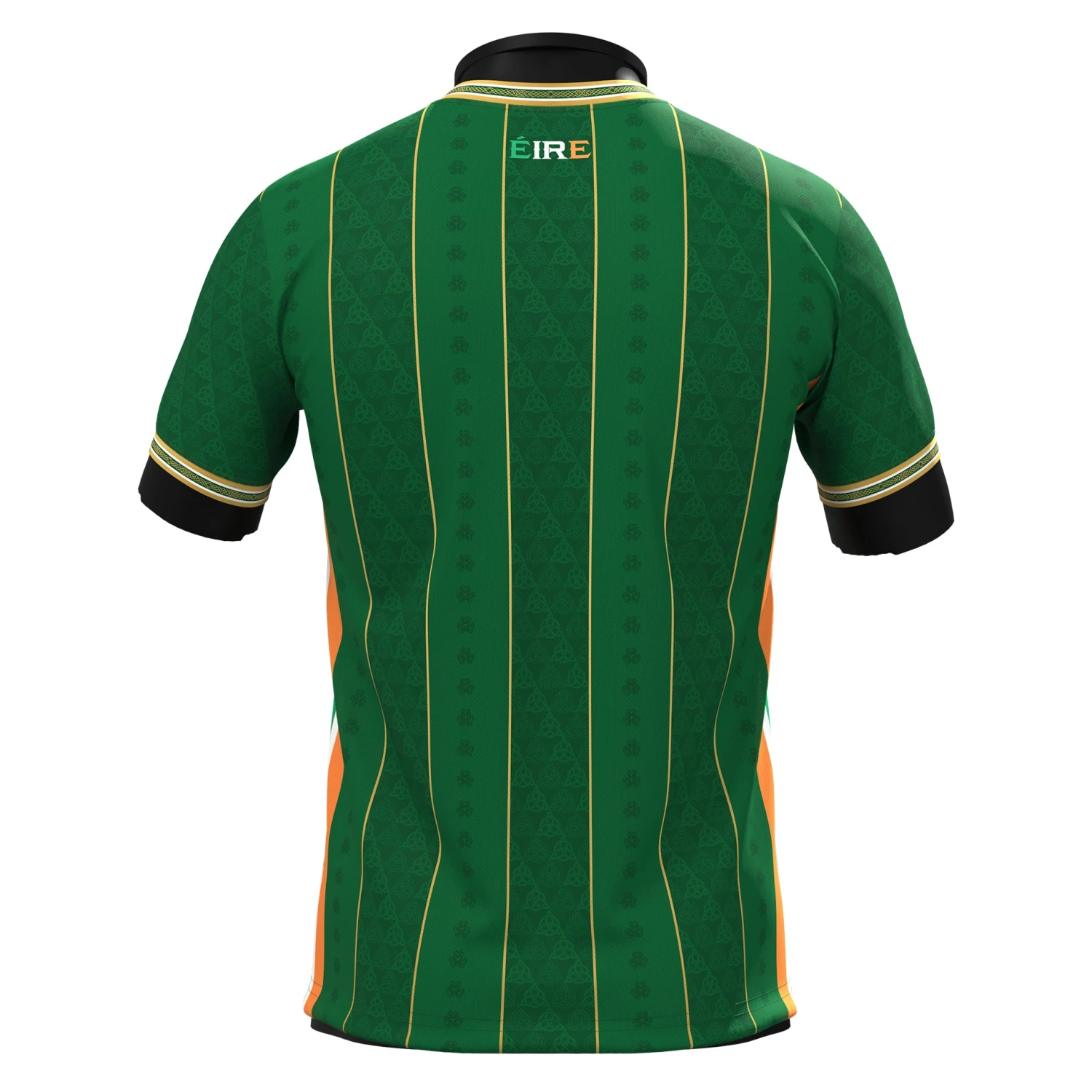 This jersey features a green base with golden vertical stripes, symbolizing the strings of the Irish harp — a national emblem of Ireland. Within the stripes, you’ll find Celtic knot patterns and shamrocks, representing unity, tradition, and national pride. On the back neck, “Éire” is printed in the Irish flag colors, honoring the country’s language and identity.