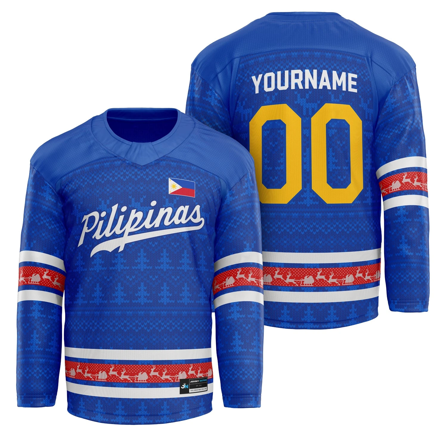 Show your Filipino pride this holiday season with our fully sublimated Philippines Christmas Custom Hockey Jersey. Designed with festive Christmas Holiday patterns and national colors, this jersey is perfect for Christmas parties, family gatherings, and holiday gifting.