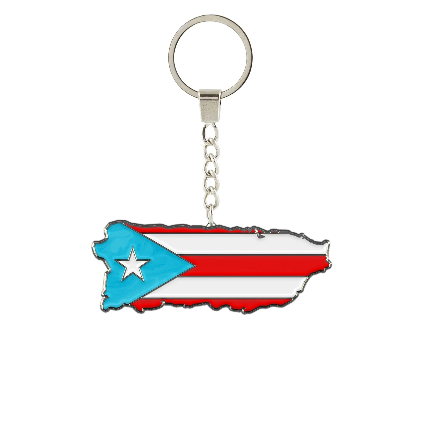 Show your pride with this beautifully crafted Puerto Rico key chain, shaped like the island and featuring the iconic flag in bold red, white, and azul celeste blue.